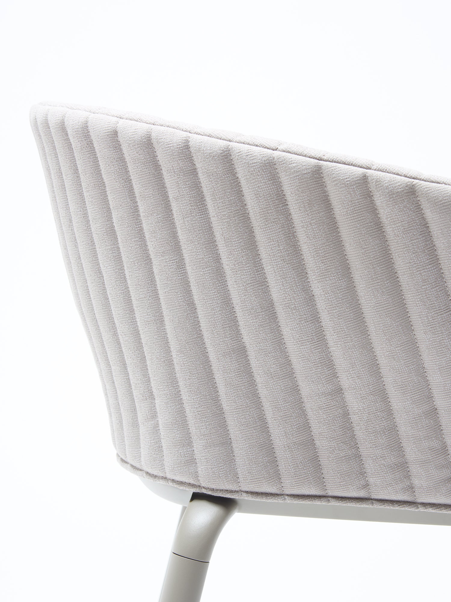 La poltroncina Ria con schienale trapuntato, disegnata da Alberto Lievore, porta una nota di raffinato comfort nella collezione Ria. La seduta, realizzata in alluminio verniciato, è arricchita da uno schienale imbottito trapuntato in gomma poliuretanica e fibra di poliestere, rimovibile tramite velcro: un tocco accogliente che unisce estetica e funzionalità in ambienti outdoor e contract.