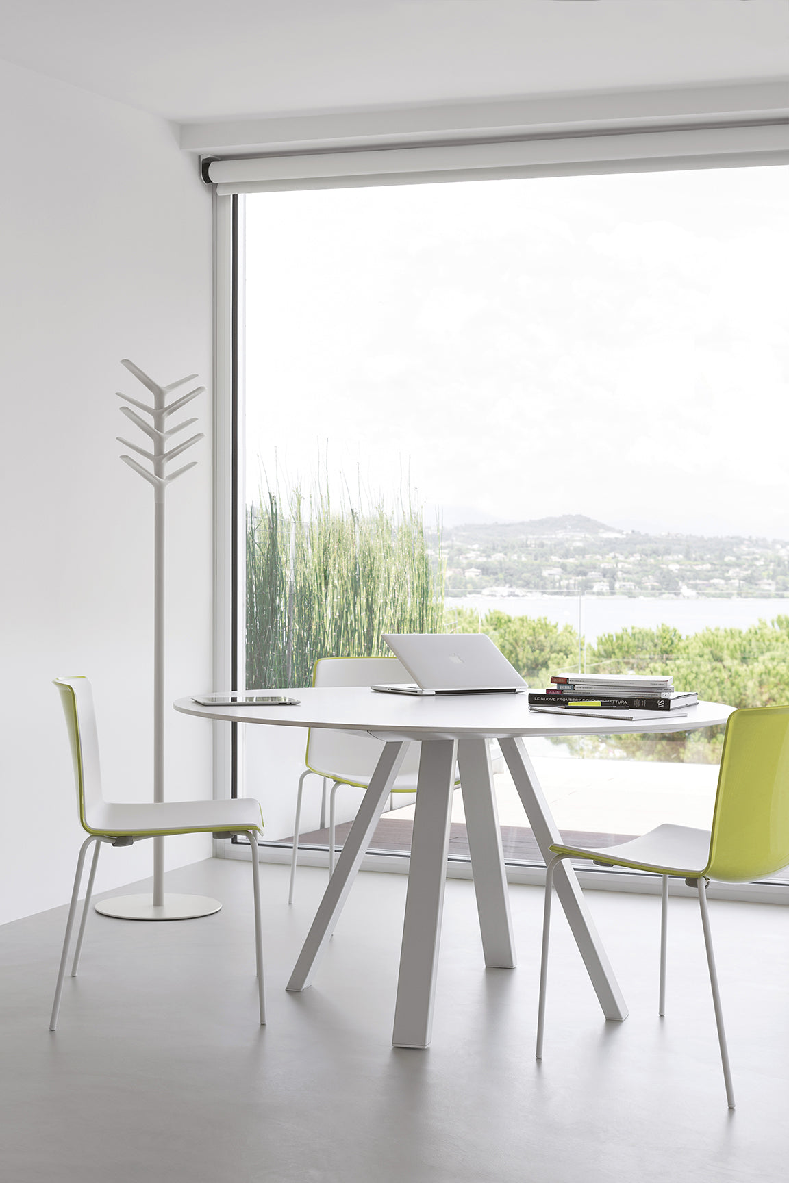Flag è una collezione di appendiabiti frutto della sintesi di forma e funzione. Appendiabiti da terra con base e colonna in acciaio verniciato e bracci in polipropilene caricato con fibra di vetro. Risulta estremamente versatile grazie alla possibilità di variare a piacere la posizione dei 4 bracci, assicurando sempre la sua piena funzionalità e la libertà di creare geometrie nuove. Con gancio portaborse.