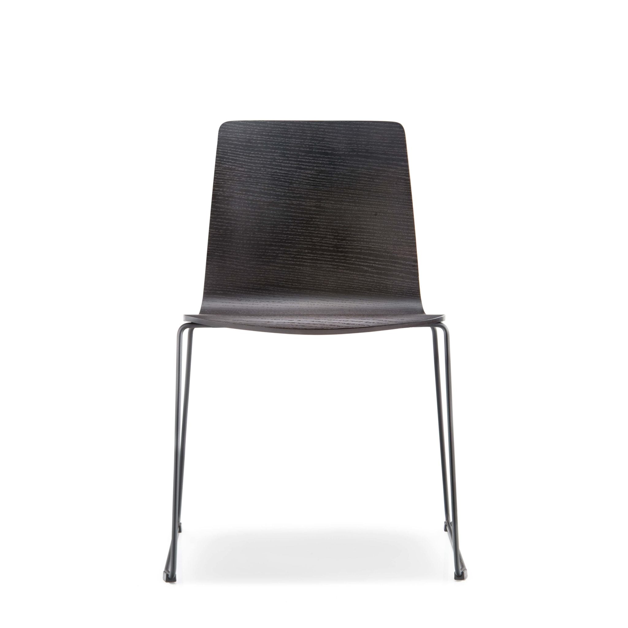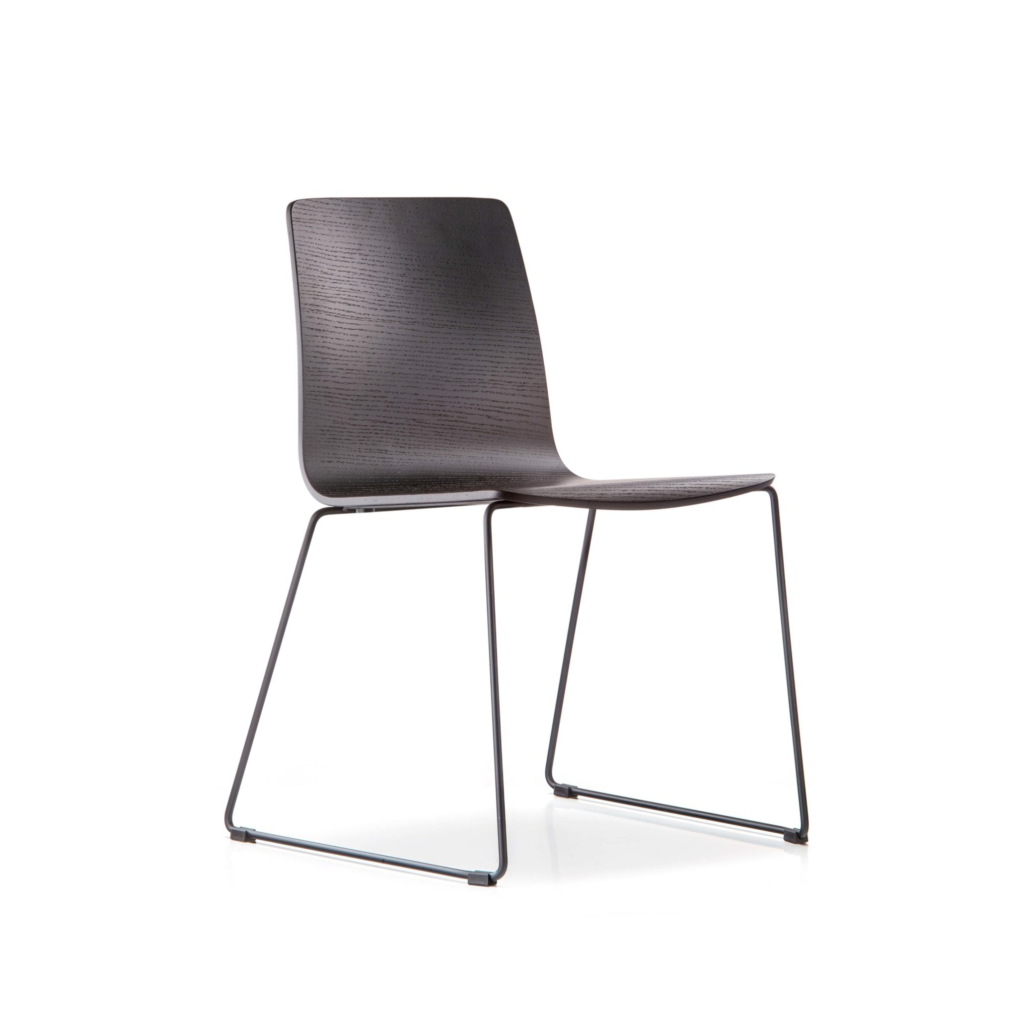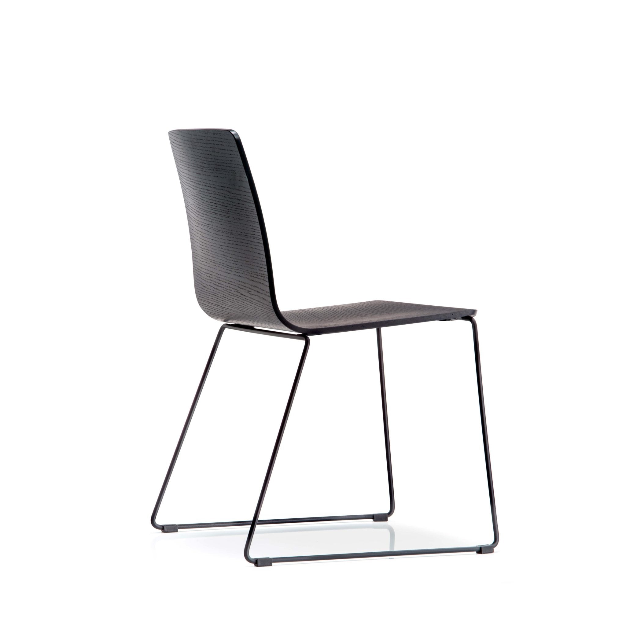 Inga deve il suo nome all’eleganza femminile nord-Europea. Sedia con scocca in multistrato di rovere impiallacciato e struttura a slitta in filo d’acciaio Ø 10 mm, verniciato o cromato.