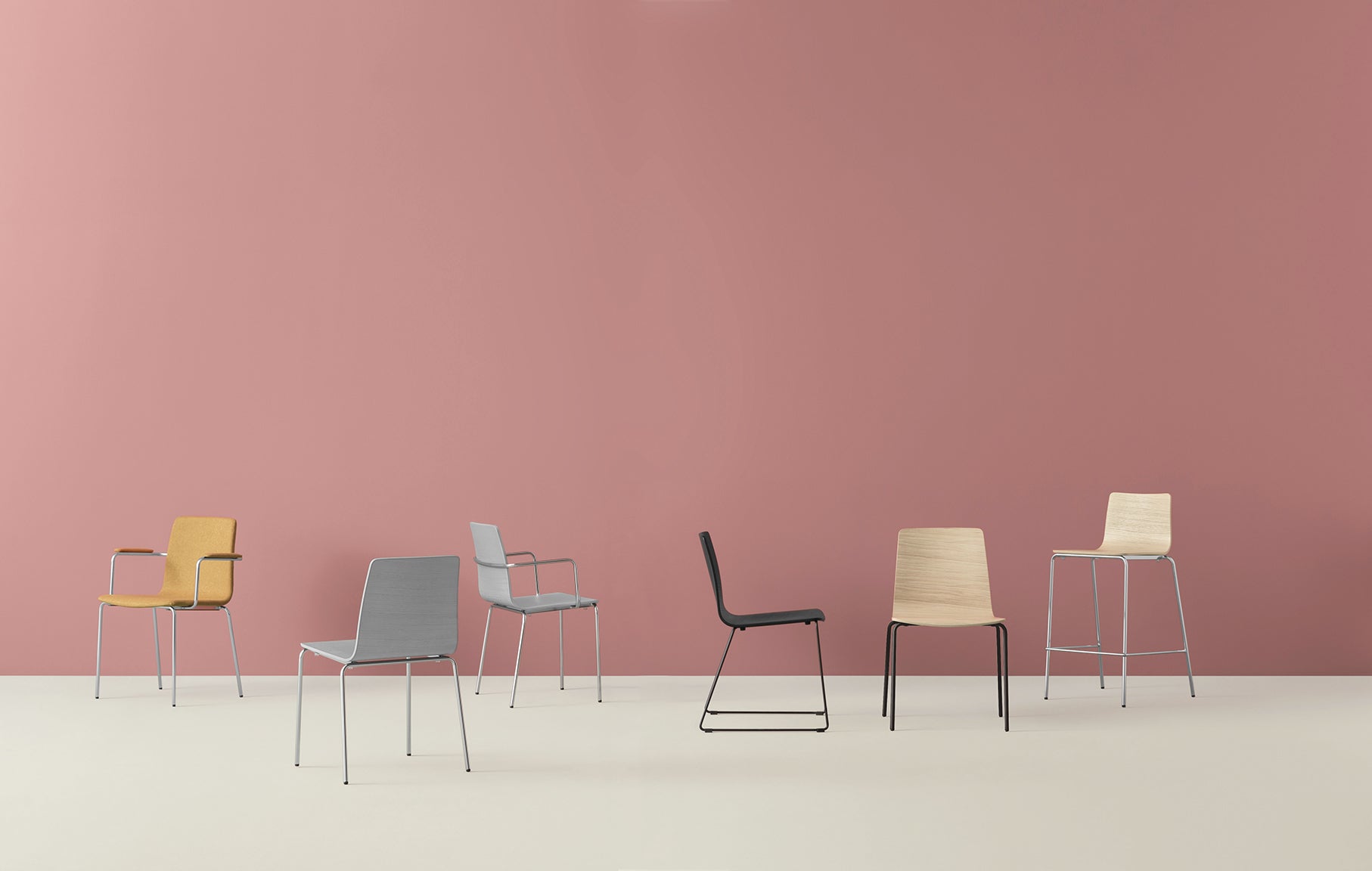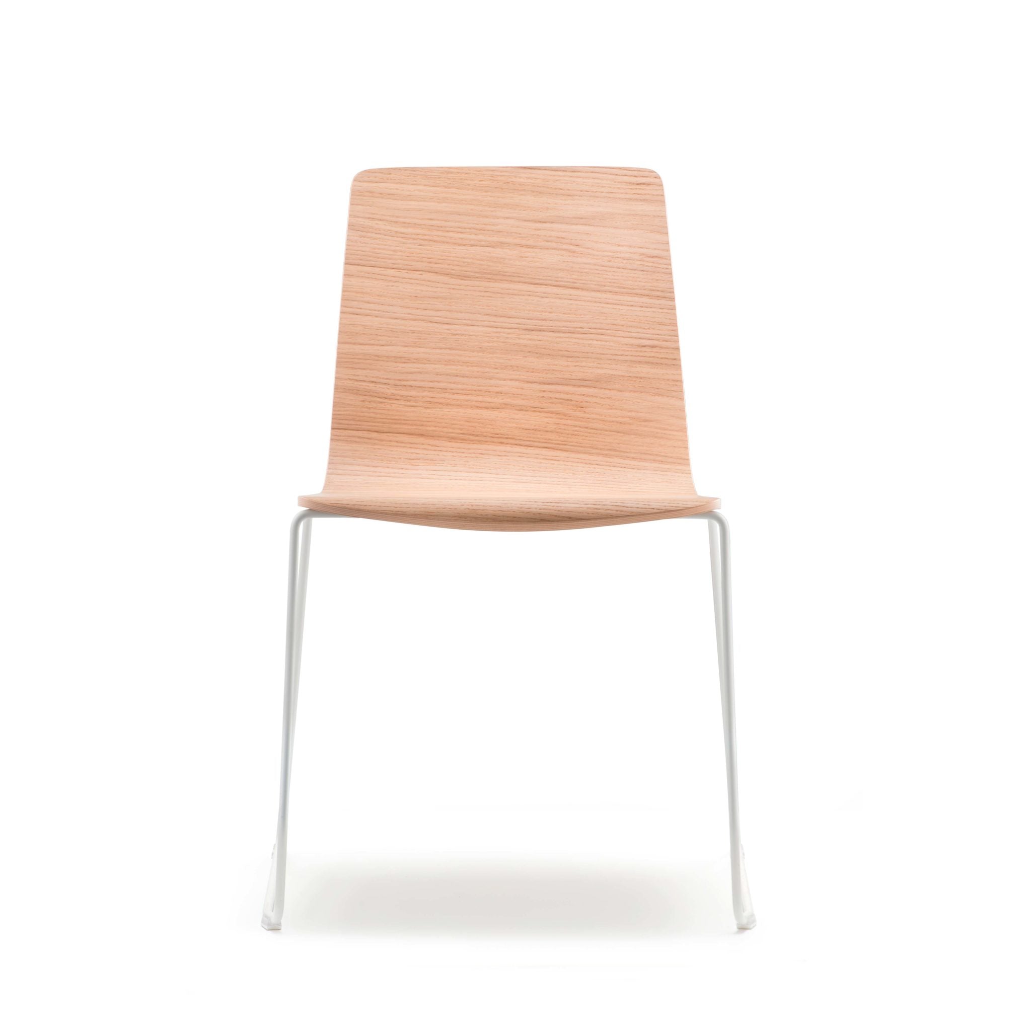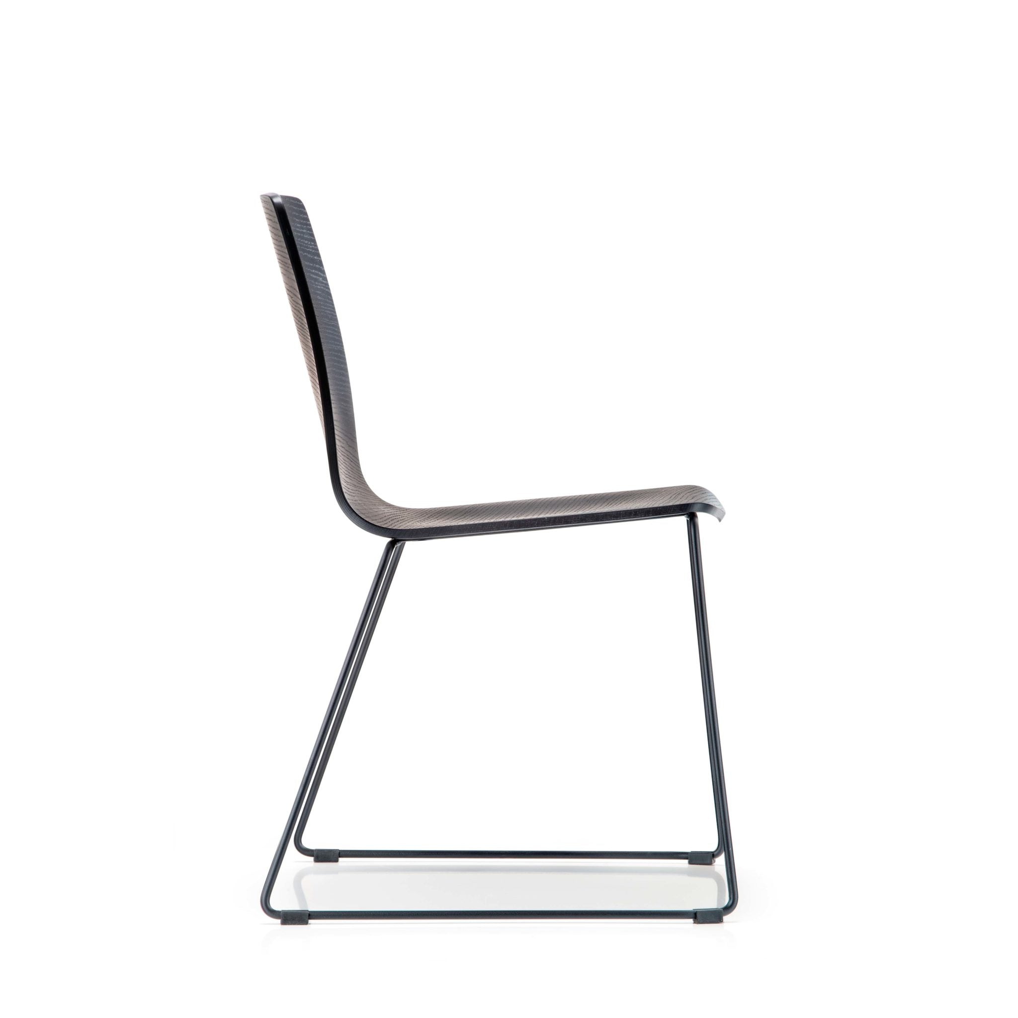 Inga deve il suo nome all’eleganza femminile nord-Europea. Sedia con scocca in multistrato di rovere impiallacciato e struttura a slitta in filo d’acciaio Ø 10 mm, verniciato o cromato.