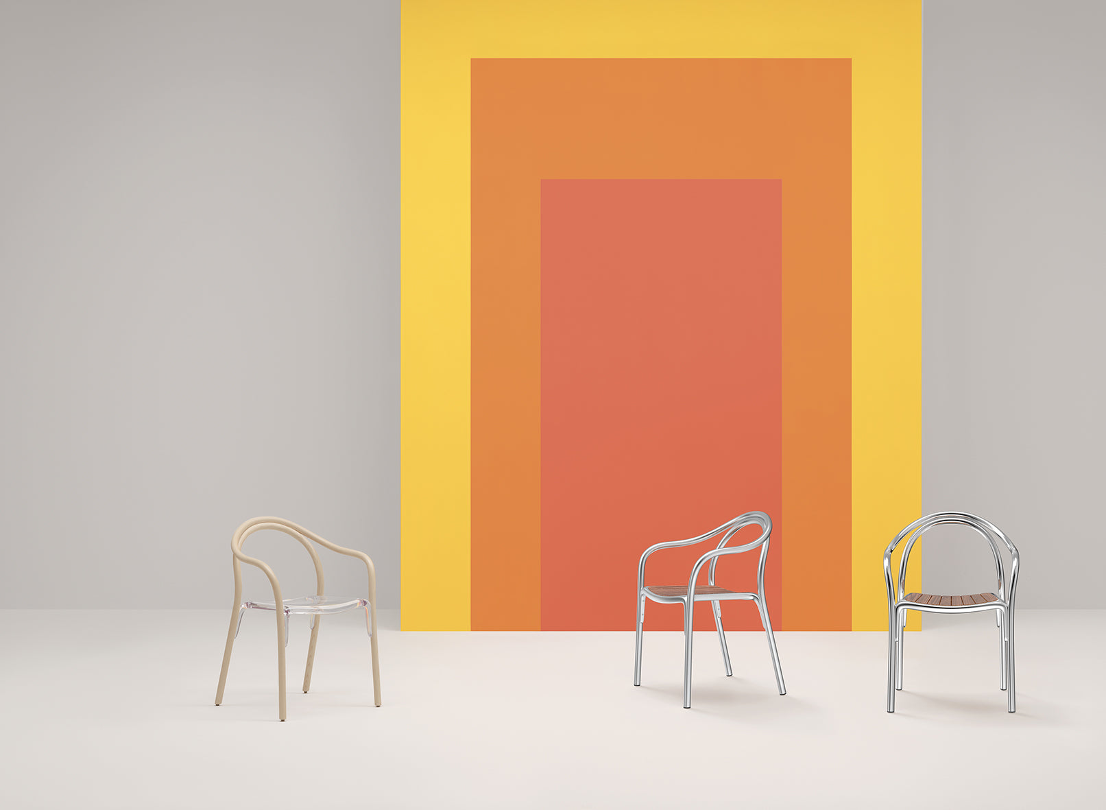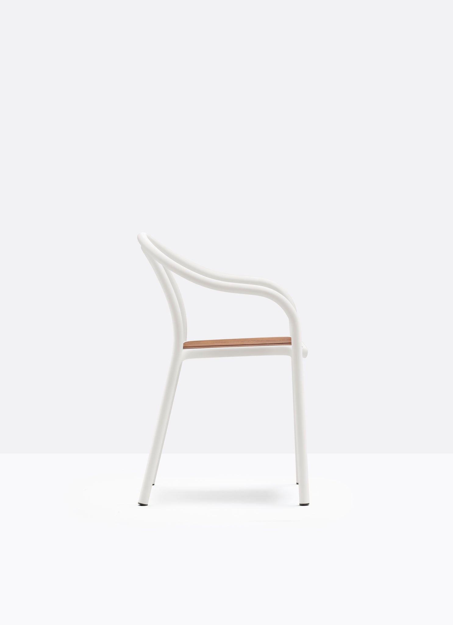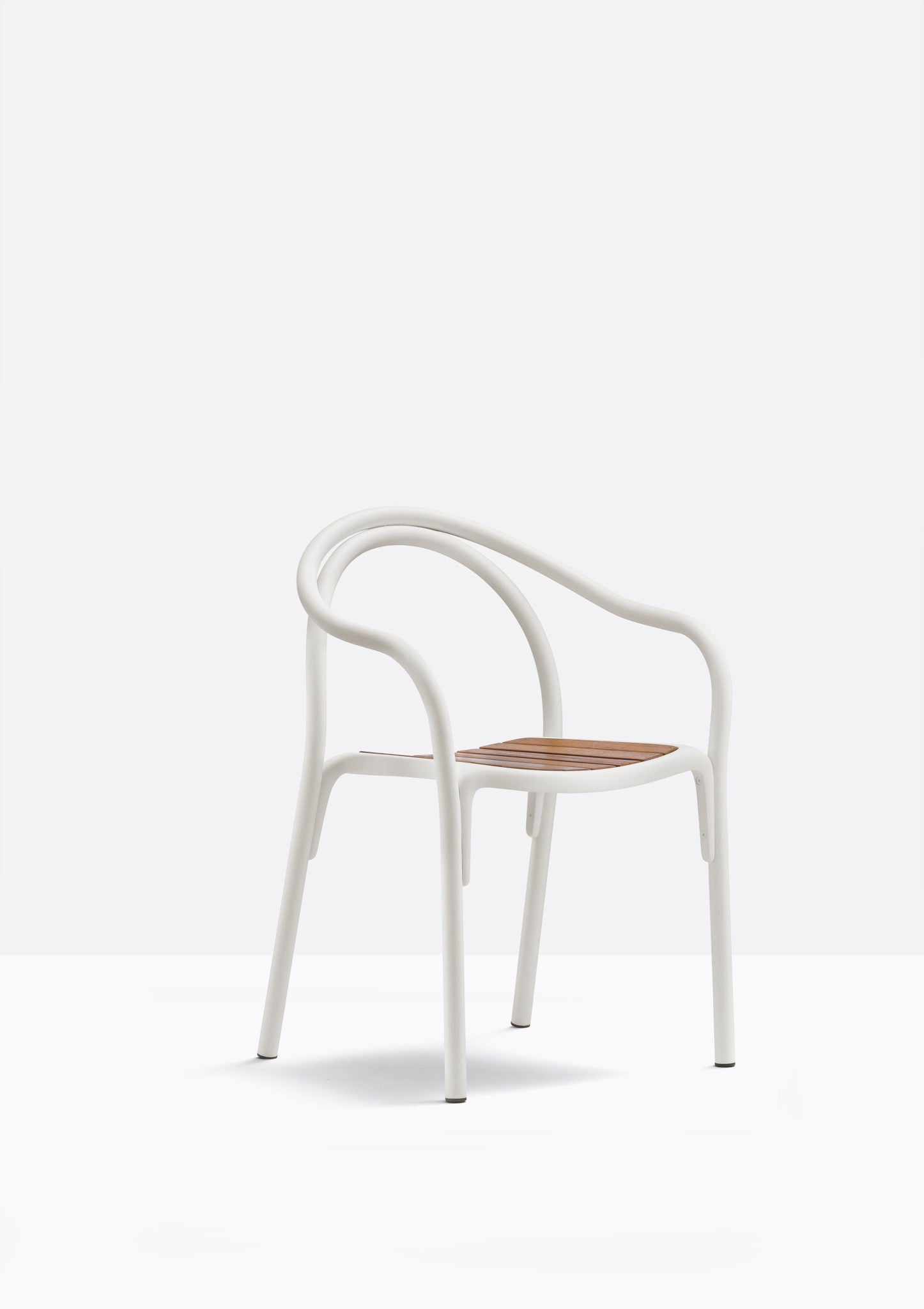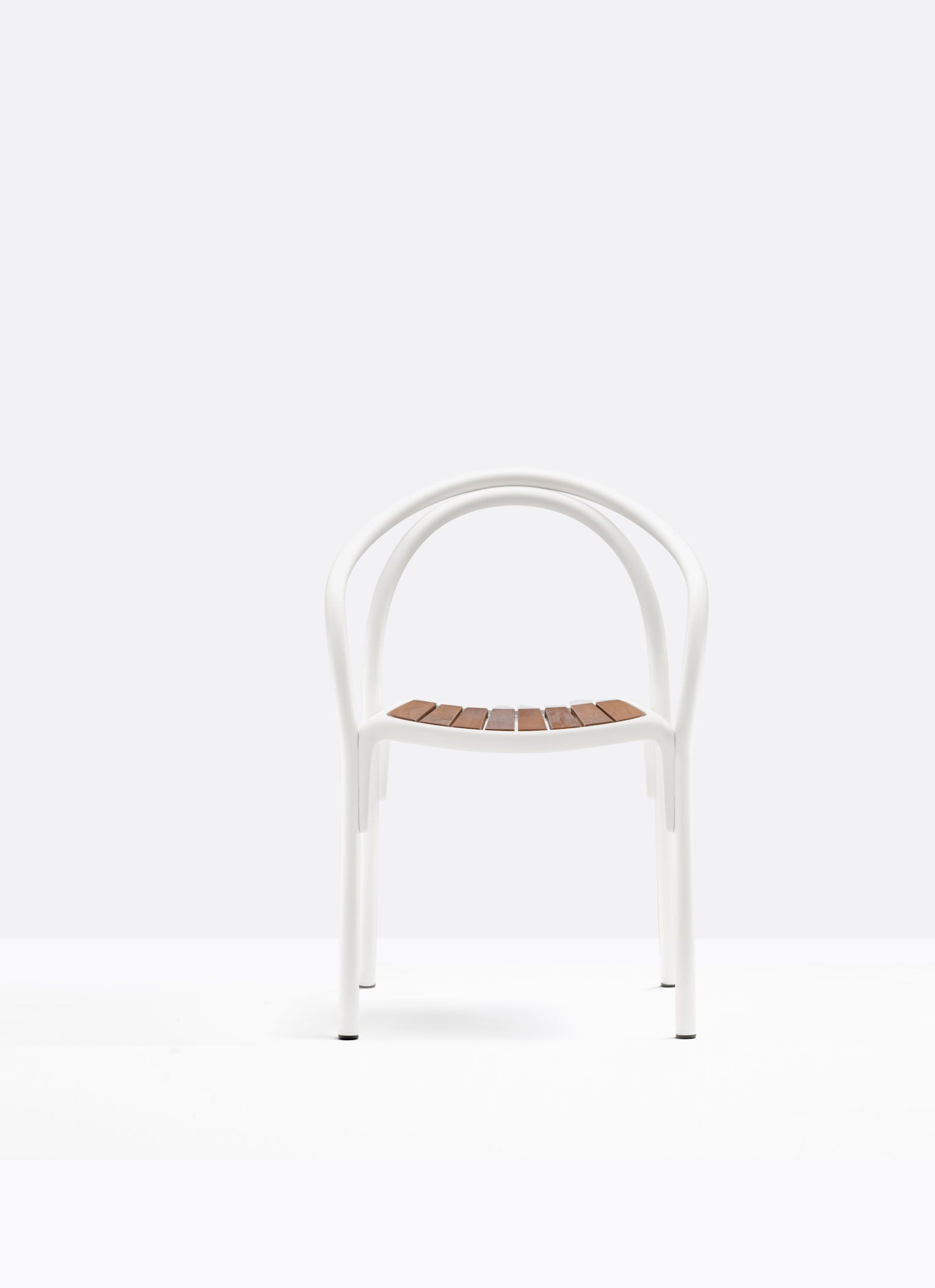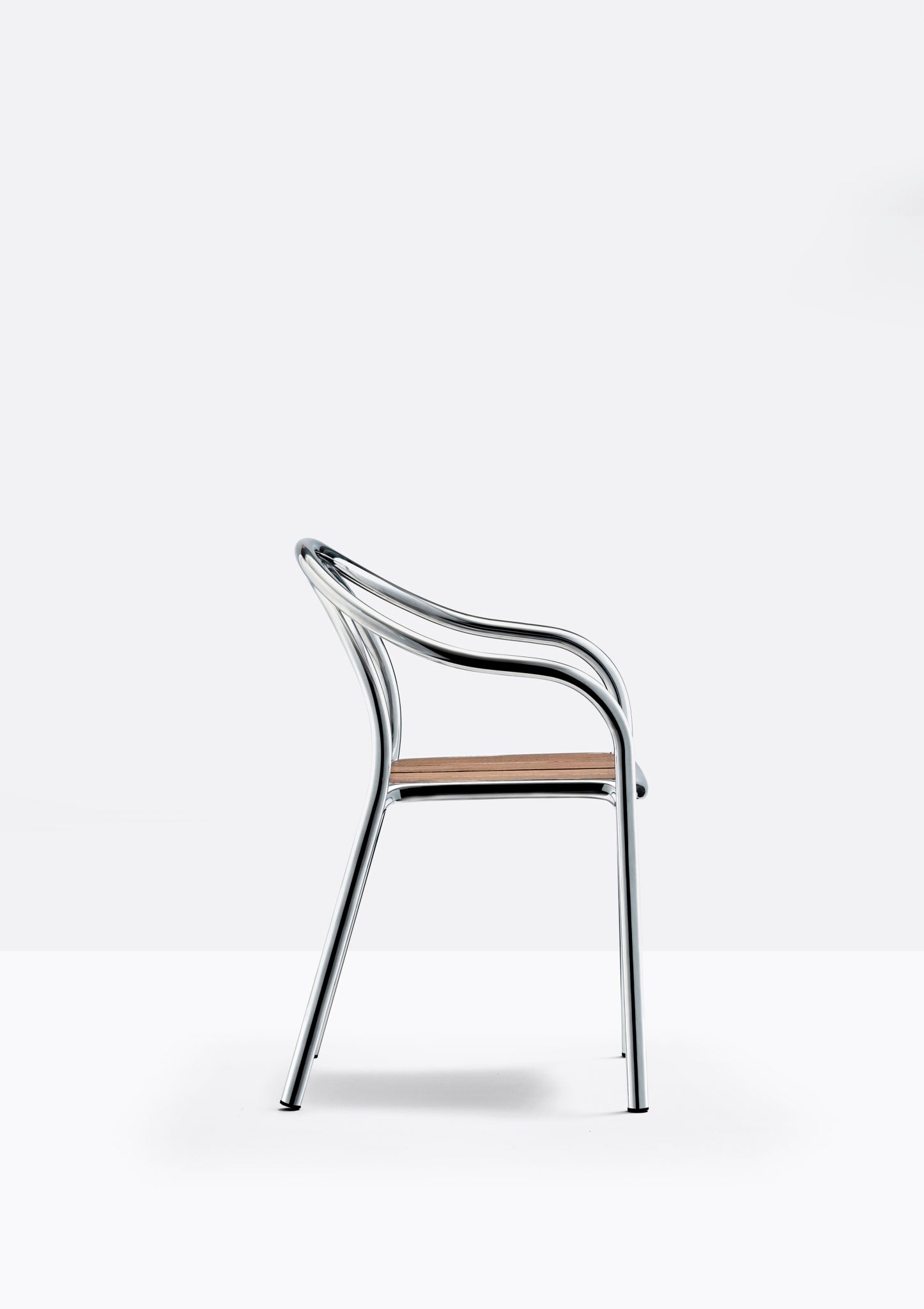 La struttura in tubo di alluminio curvato Ø 30 mm cinge un ergonomico sedile realizzato con doghe in teak sagomate, quasi lo abbracciasse. Le sue linee sinuose vengono esaltate dalla fluidità dell’alluminio, che garantisce resistenza e leggerezza, regalando al contempo un forte impatto visivo e un piacevole contrasto con il legno.
