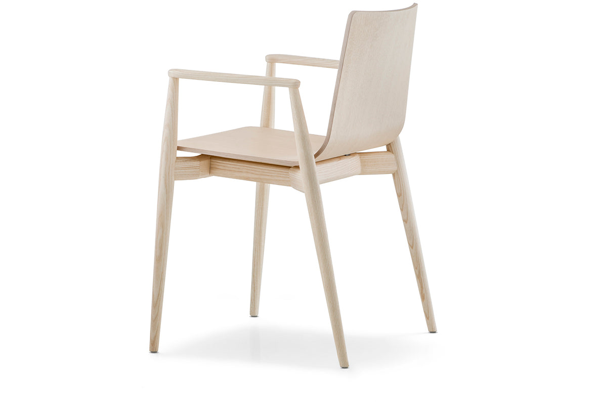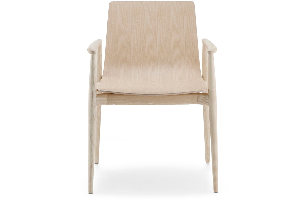 Gli elementi strutturali appaiono nella loro pura costruzione, aumentando di spessore presso le connessioni ed affusolandosi in modo naturale a favorire leggerezza ed eleganza. Poltrona con scocca in multistrato di frassino, struttura e braccioli in massello di frassino.