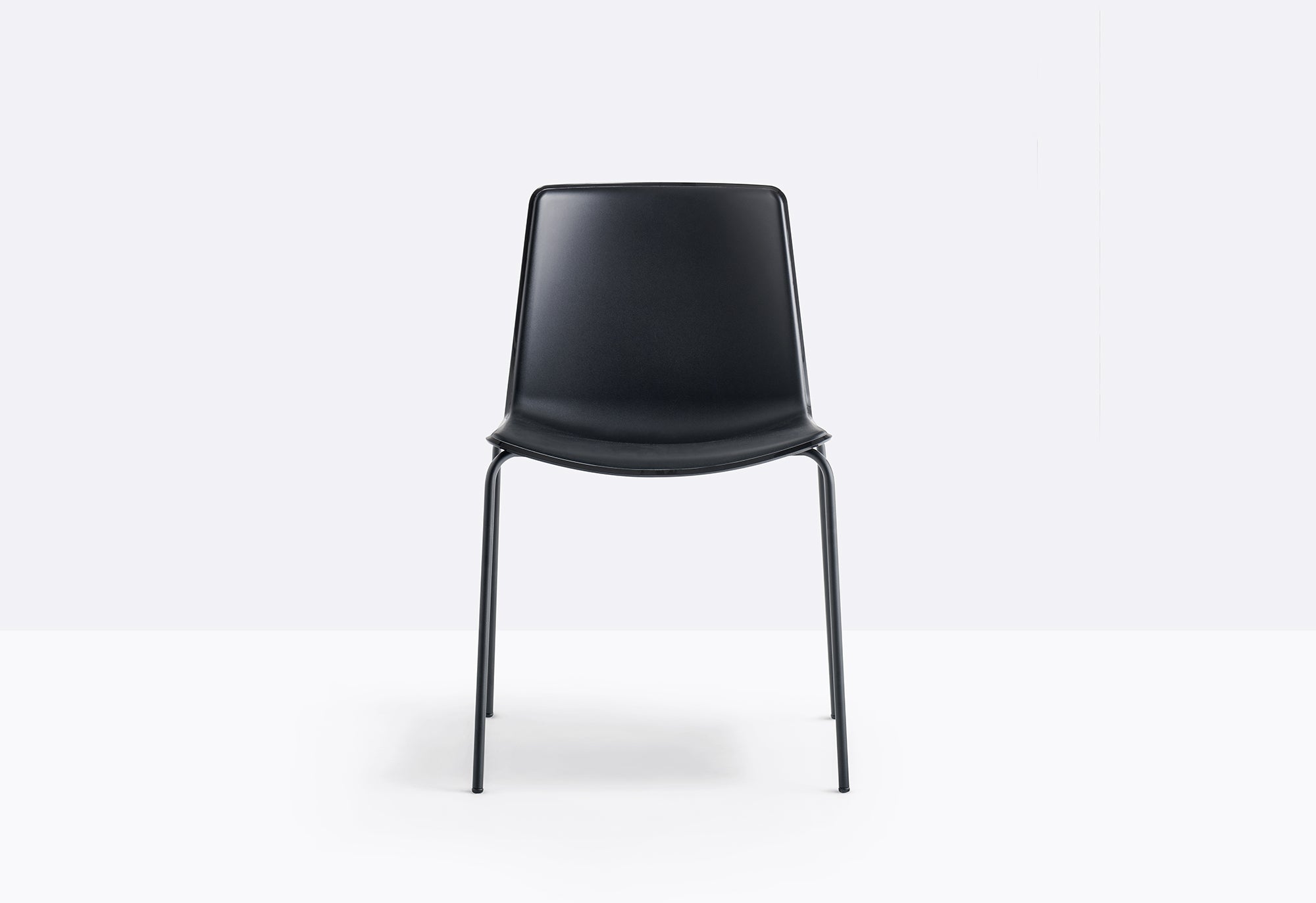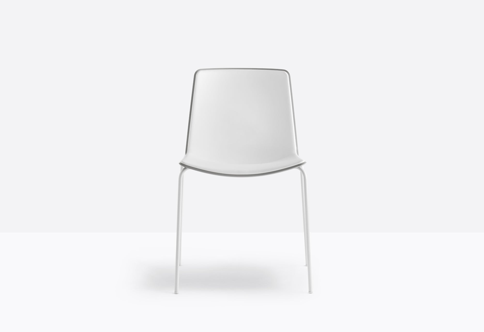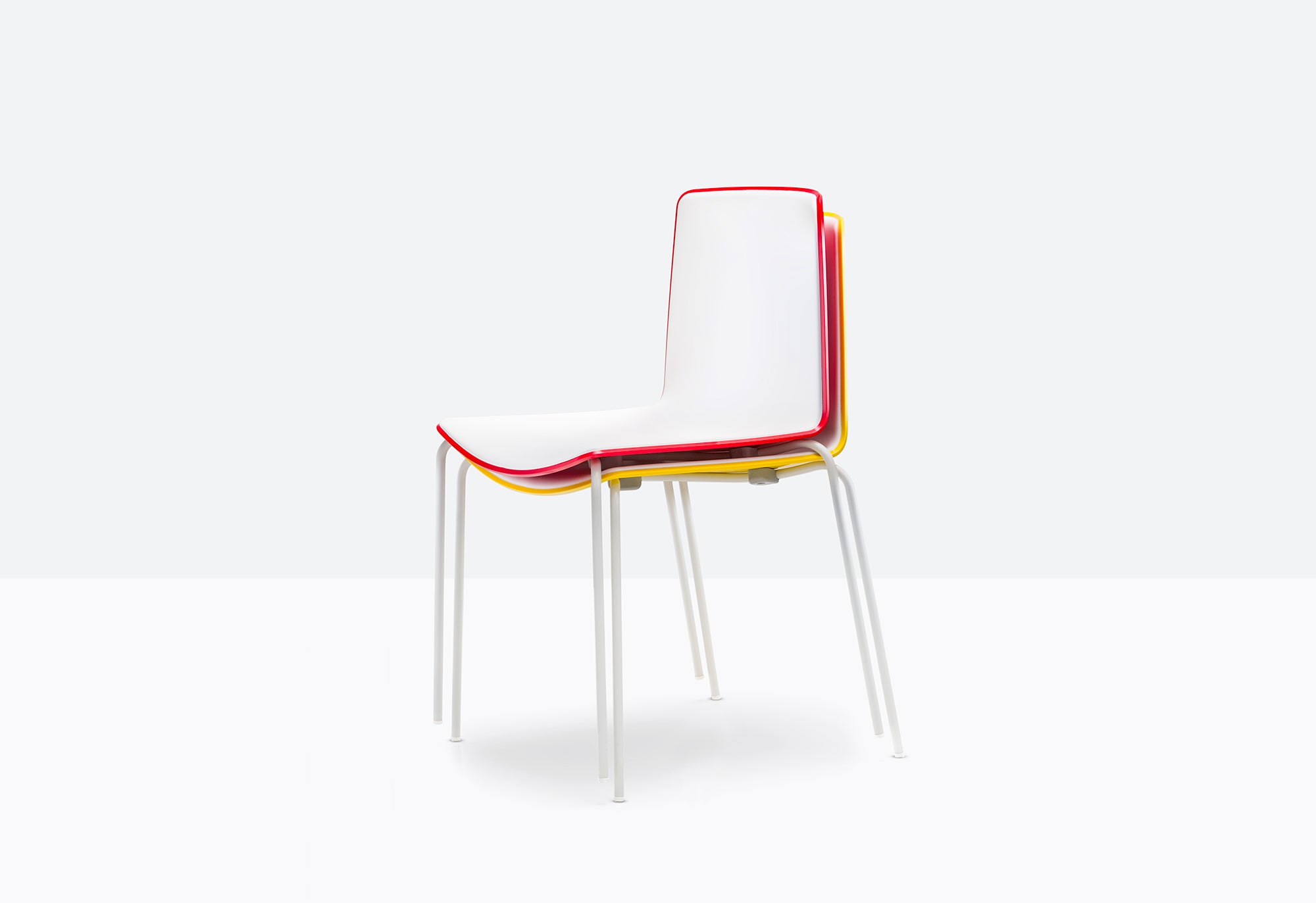 Sedia impilabile con scocca in polipropilene stampato a bi-iniezione e struttura in tubo d’acciaio Ø14 mm (verniciato in tinta, cromato o cromato nero).