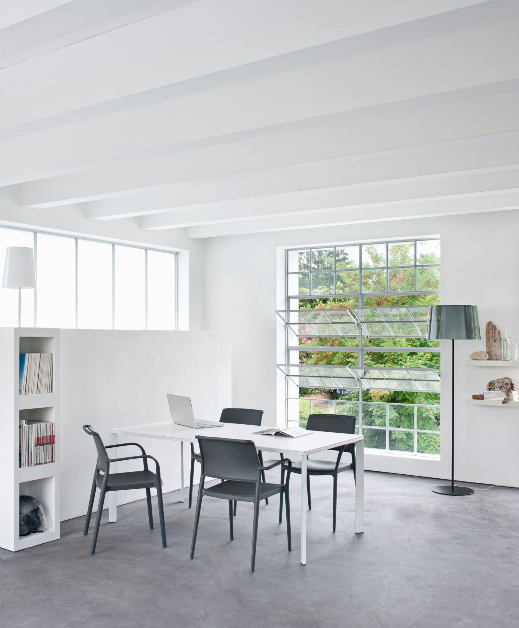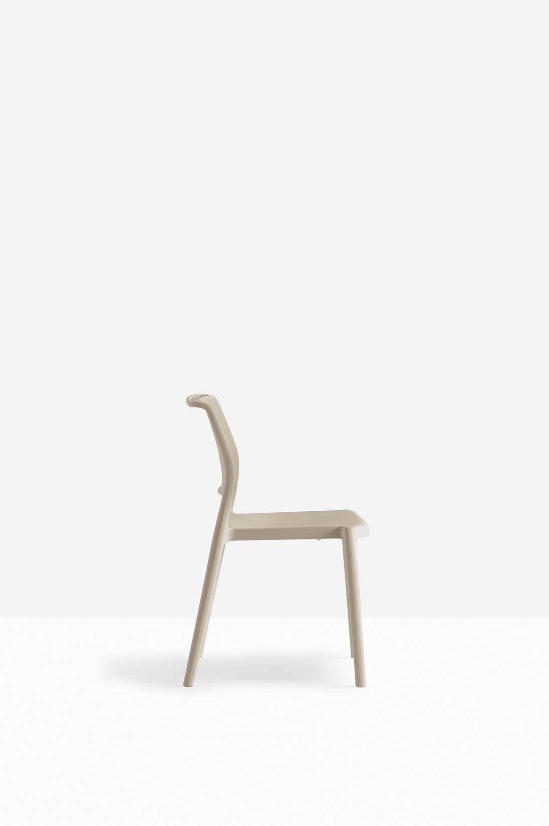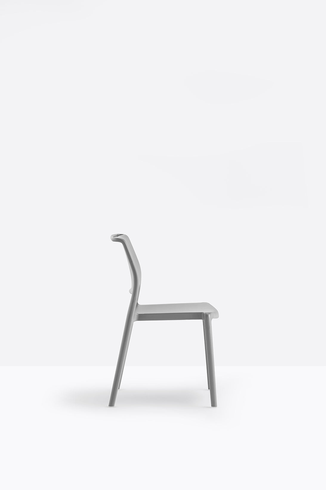 Sedia in polipropilene caricato con fibra di vetro, adatta sia per indoor che outdoor. La struttura dello schienale forma nella parte alta una grande maniglia che ne facilita il sollevamento e lo spostamento e le conferisce un distinto carattere. Grazie alla forma affusolata delle gambe appare leggera ed elegante, pur essendo robusta e indeformabile.