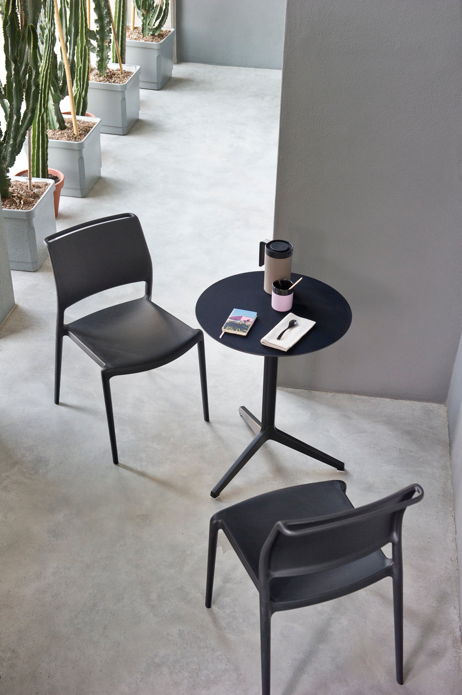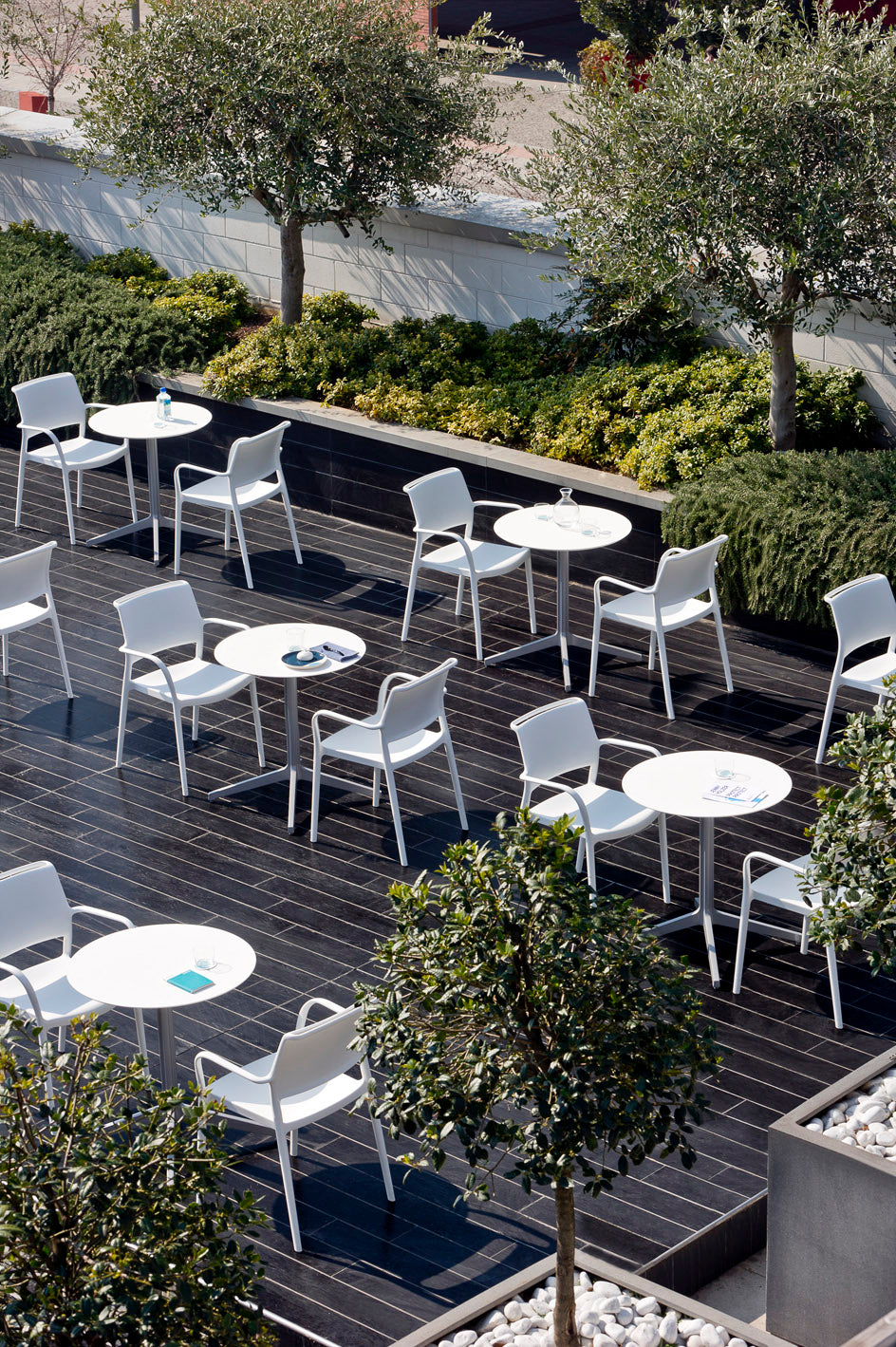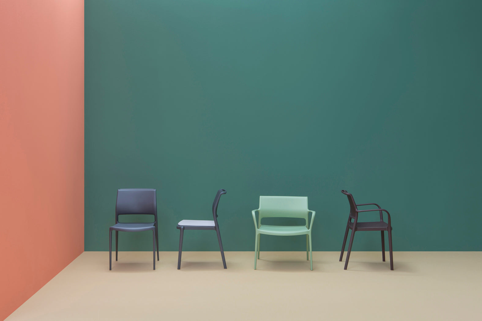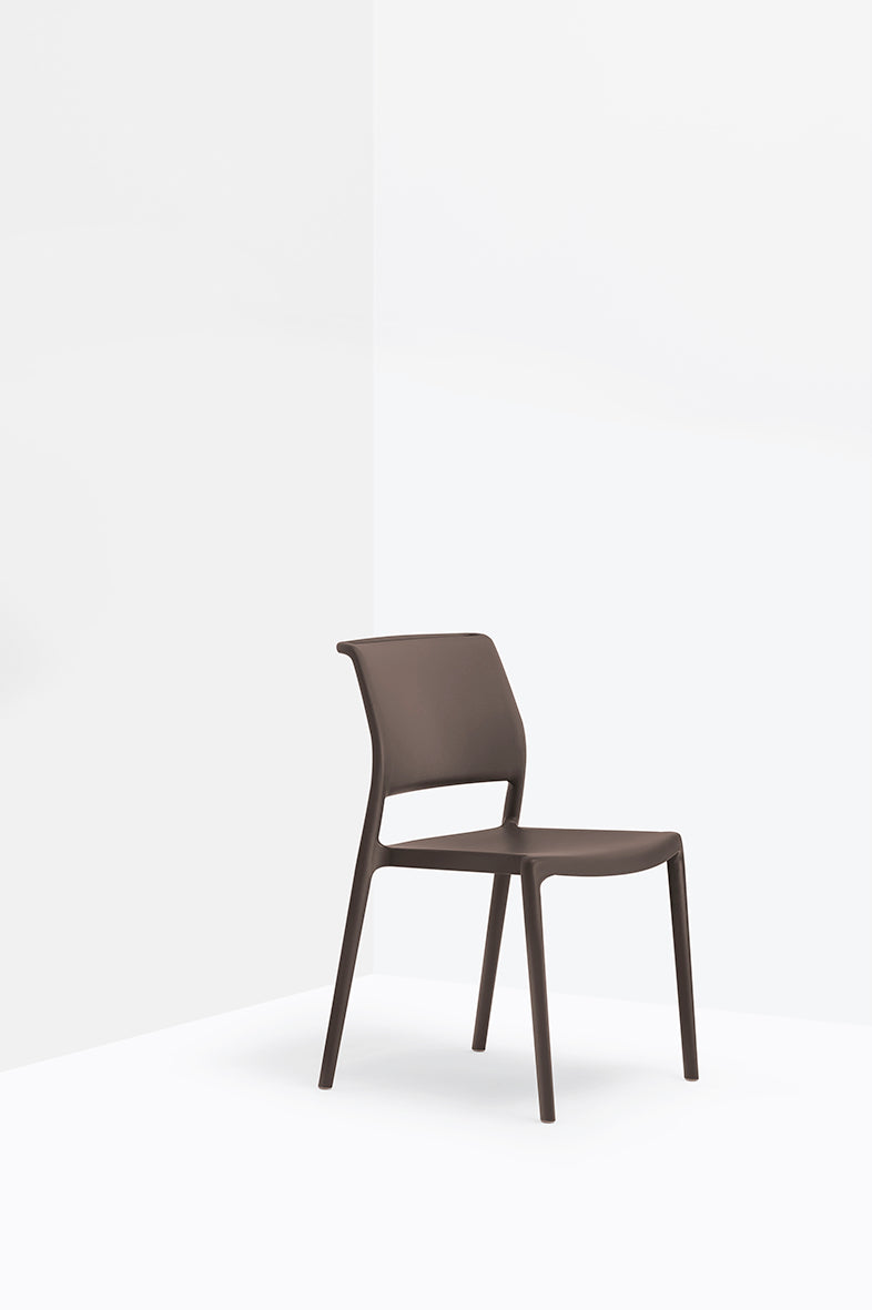 Sedia in polipropilene caricato con fibra di vetro, adatta sia per indoor che outdoor. La struttura dello schienale forma nella parte alta una grande maniglia che ne facilita il sollevamento e lo spostamento e le conferisce un distinto carattere. Grazie alla forma affusolata delle gambe appare leggera ed elegante, pur essendo robusta e indeformabile.