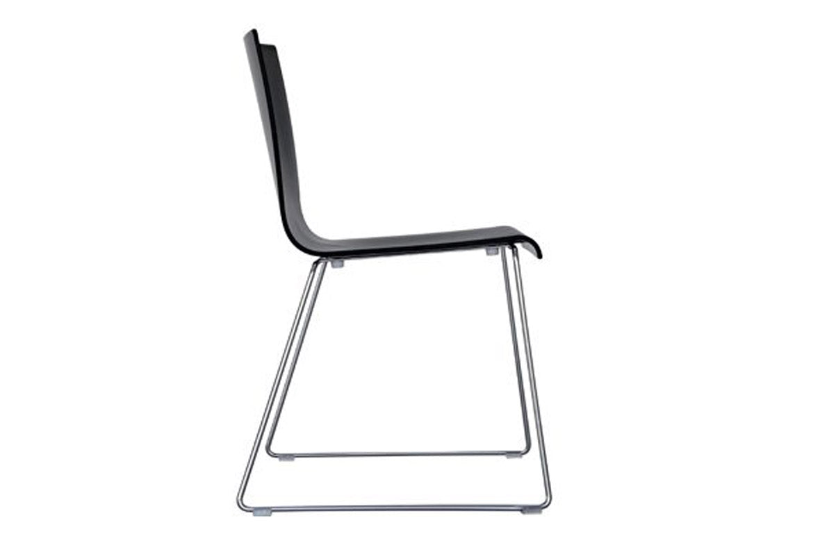Sedia impilabile con scocca in tecnopolimero disponibile in diversi colori. Telaio a slitta in filo d’acciaio Ø10mm verniciato in tinta alla scocca o cromato.