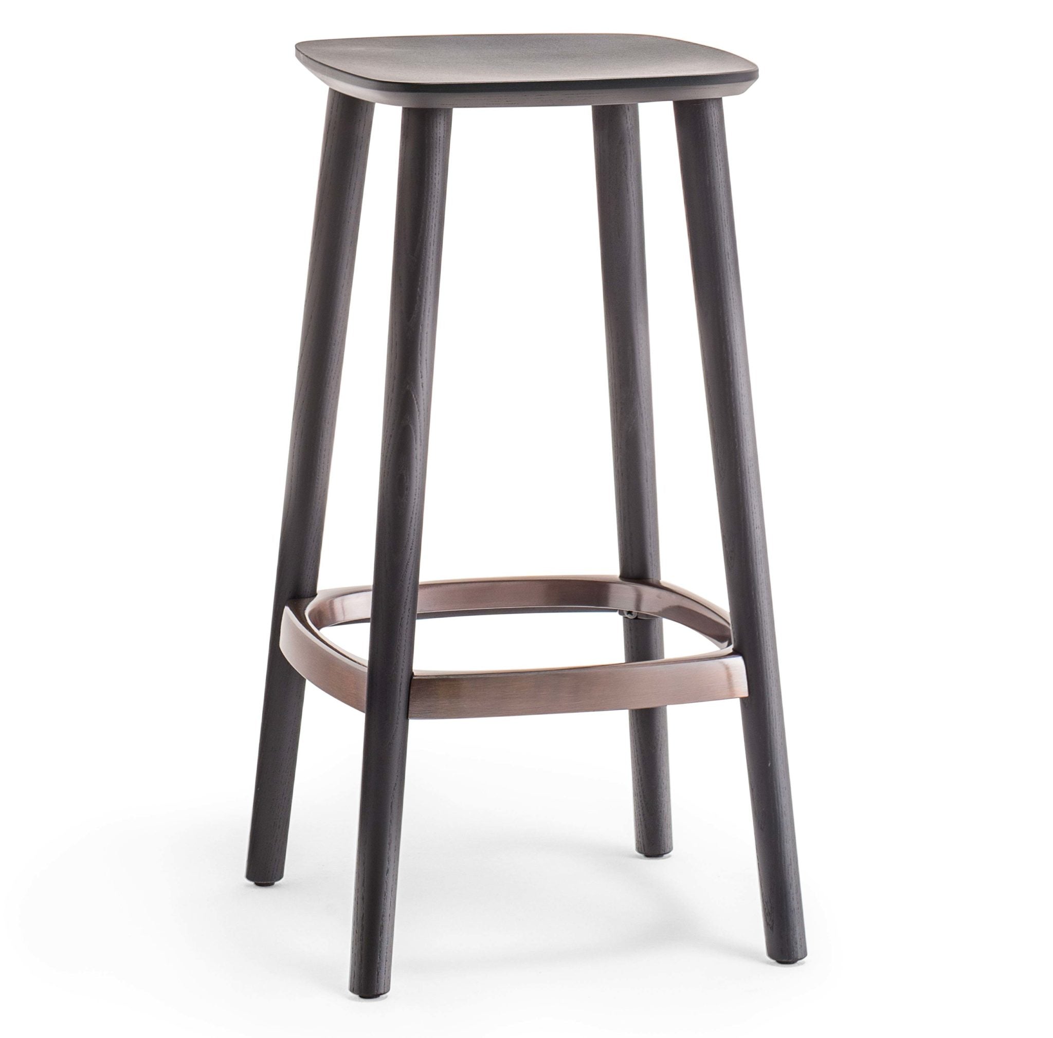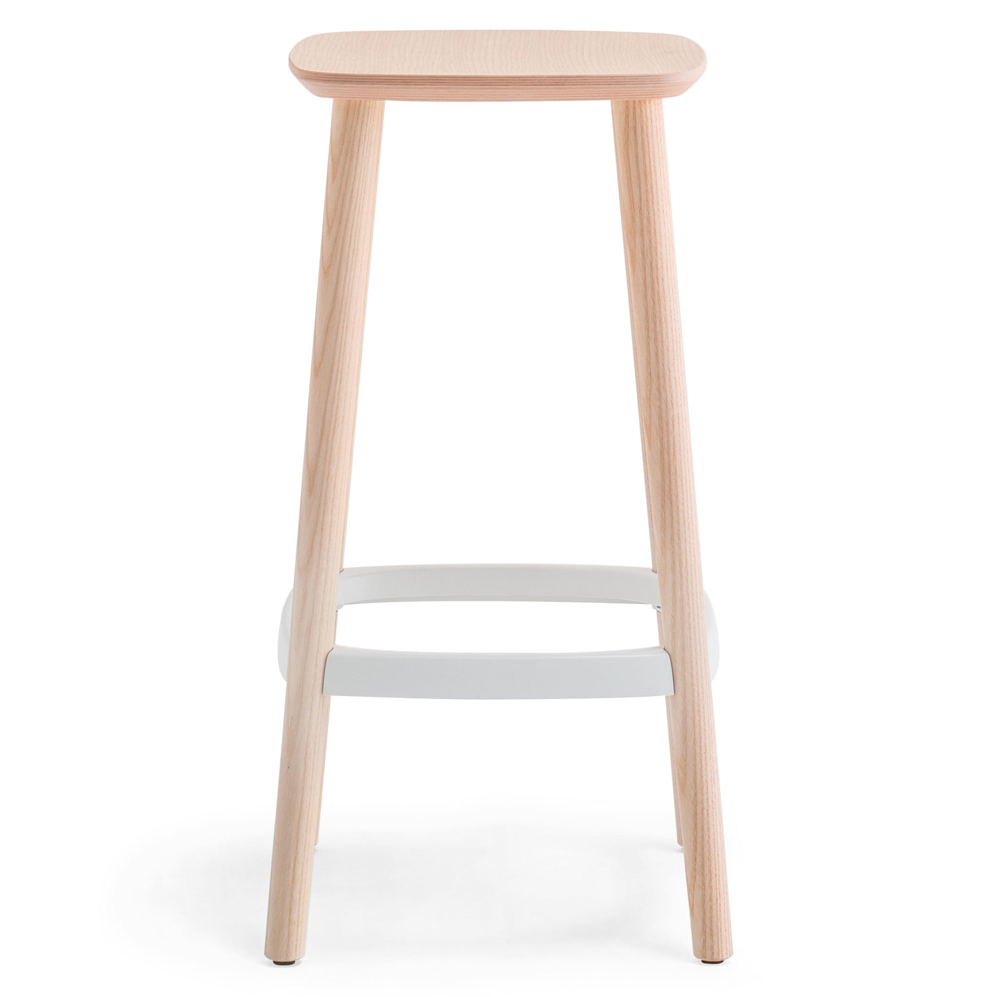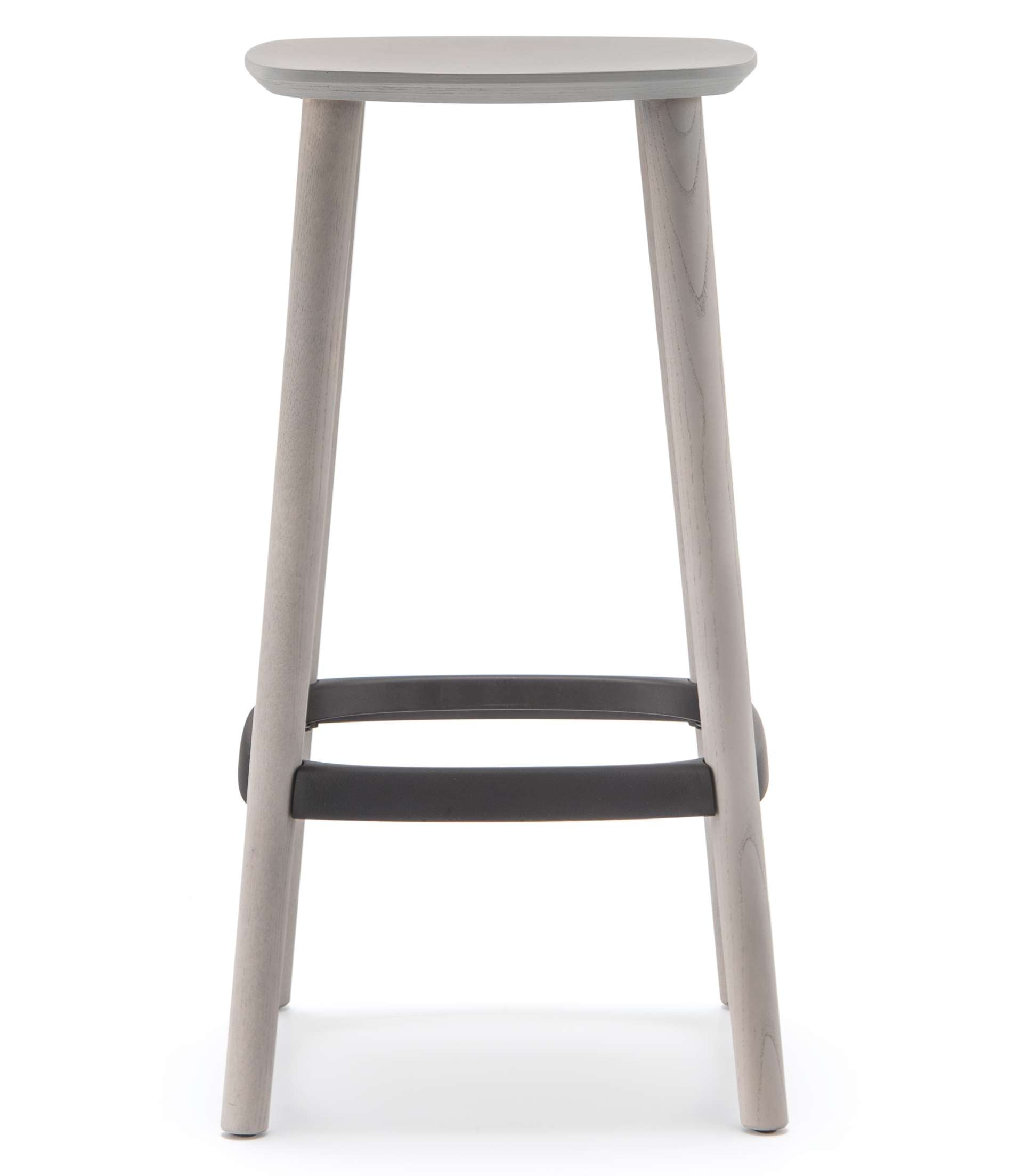 Sgabello in frassino dal look estremamente leggero. Le gambe affusolate si innestano nel sedile in multistrato senza l’aggiunta di parti di supporto, un elemento in pressofusione di alluminio garantisce l’appoggio per i piedi, incorniciando il legno e donandogli robustezza. Altezza 650 mm.