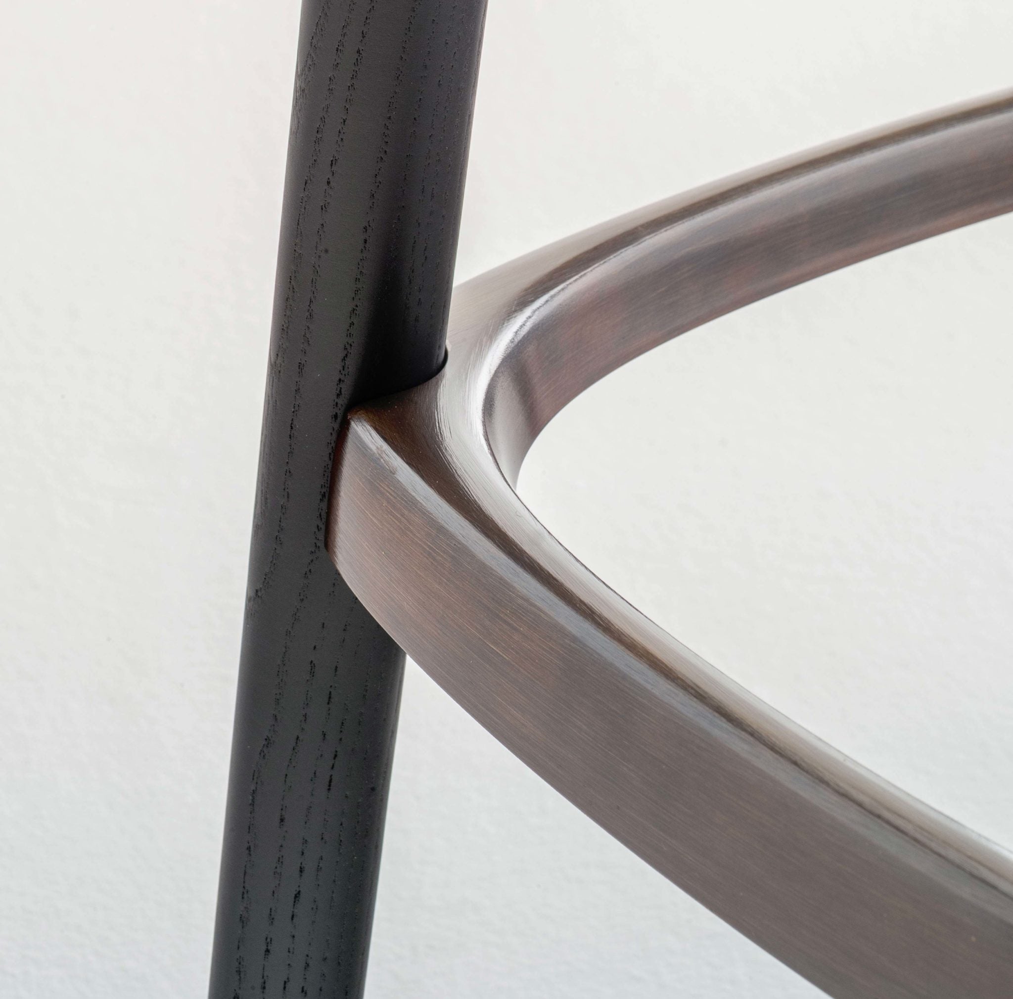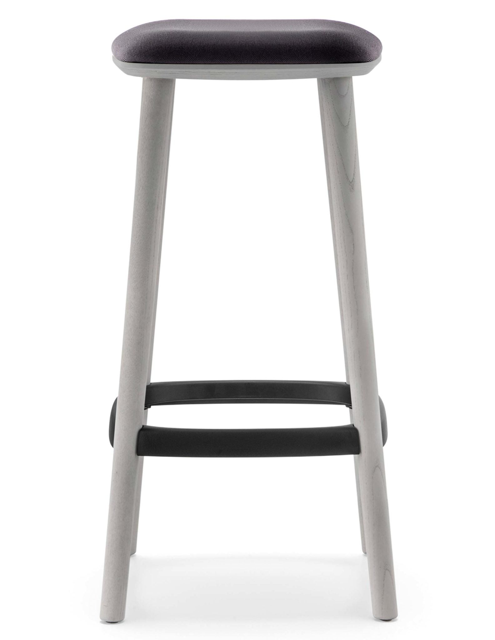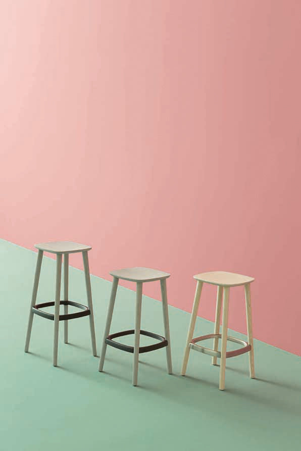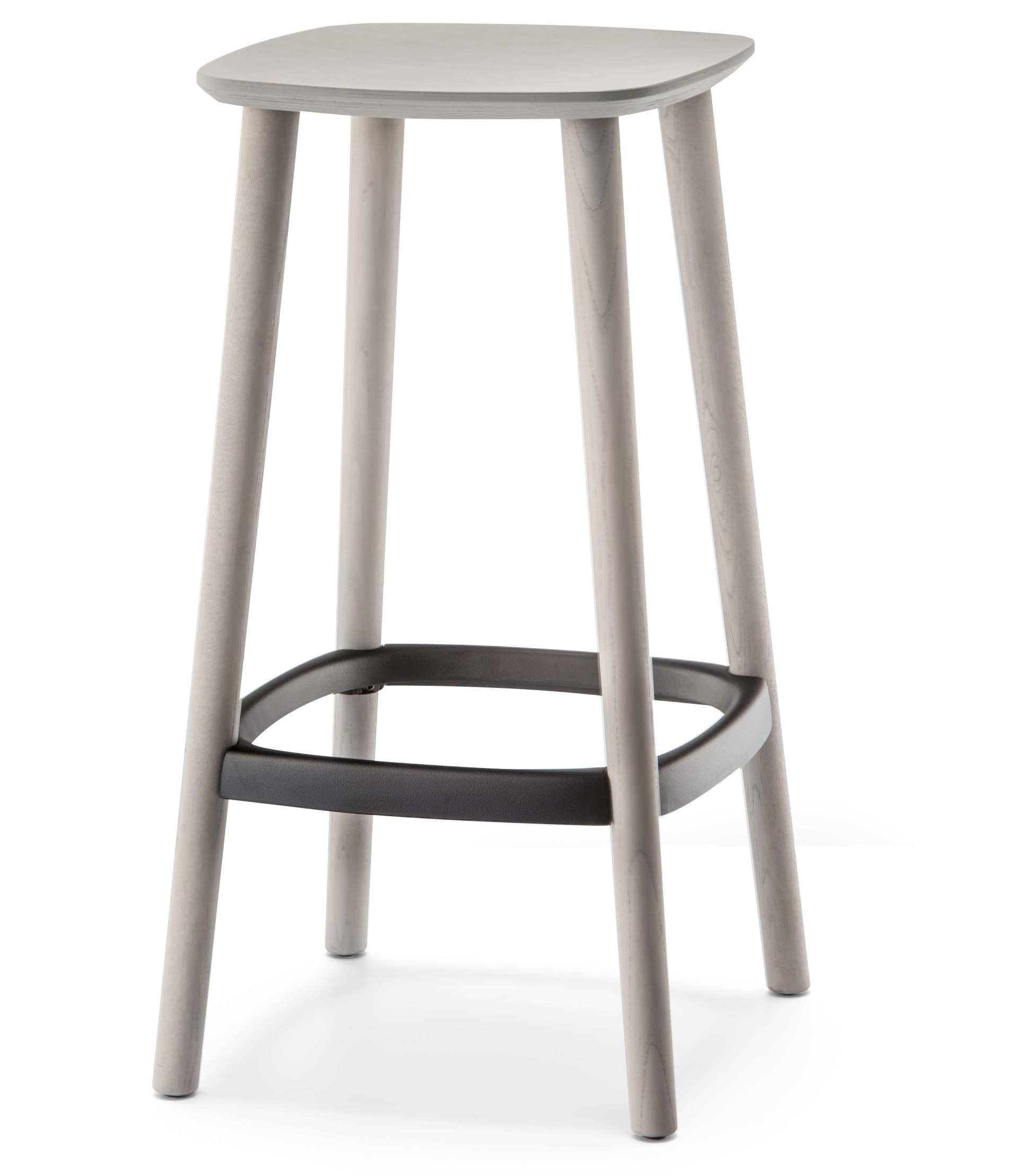 Sgabello in frassino dal look estremamente leggero. Le gambe affusolate si innestano nel sedile in multistrato senza l’aggiunta di parti di supporto, un elemento in pressofusione di alluminio garantisce l’appoggio per i piedi, incorniciando il legno e donandogli robustezza. Altezza 650 mm.