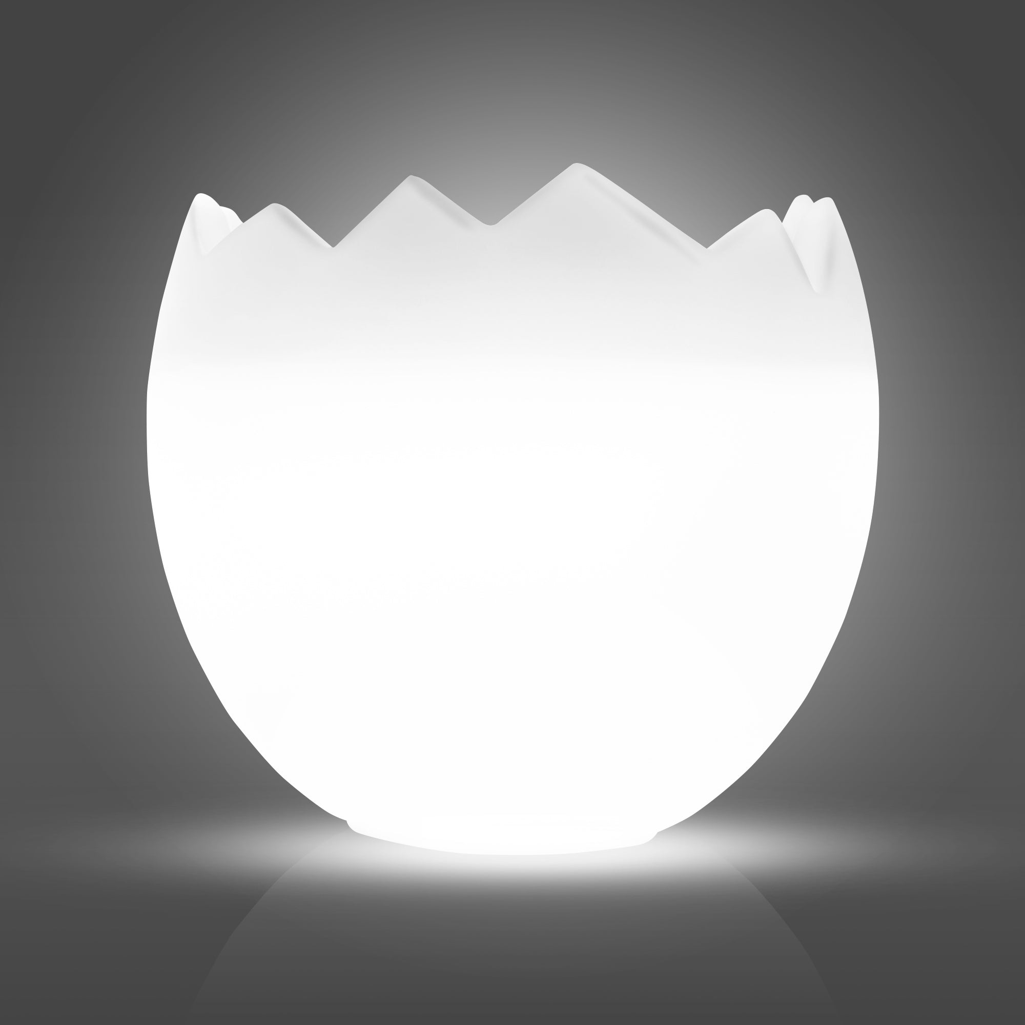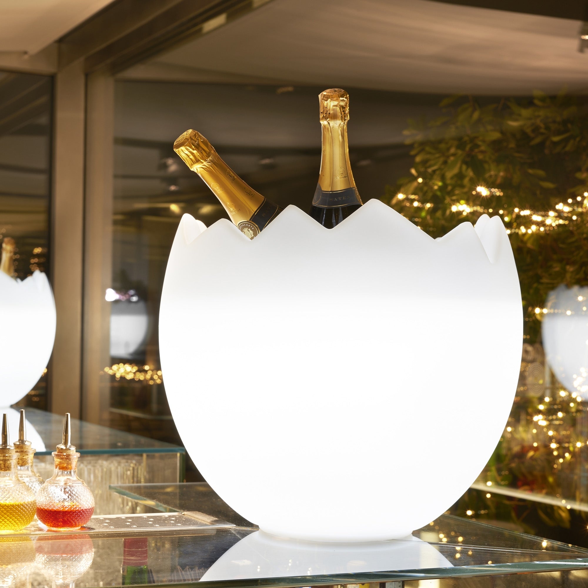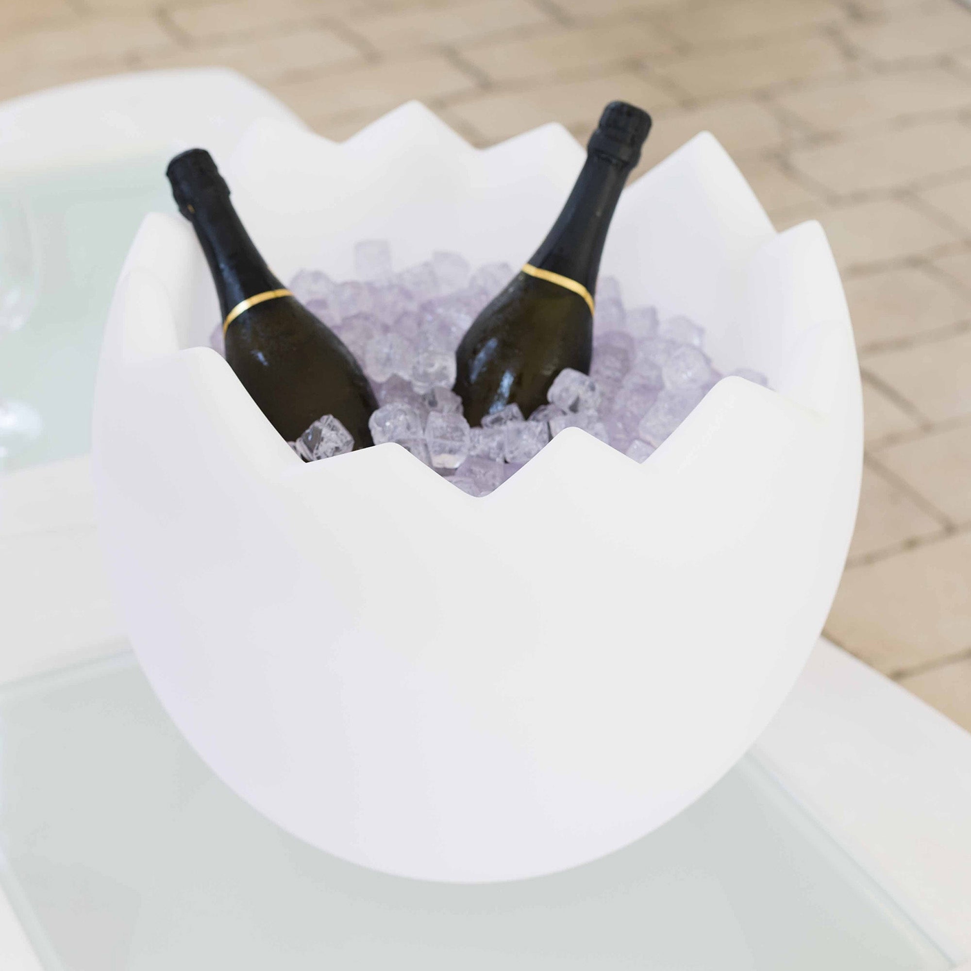 Kalimera è il protagonista indispensabile per illuminare i brindisi con ironia e giocosità, un secchiello portaghiaccio luminoso senza fili. Kalimera, in greco “buongiorno”, rievoca il guscio di un uovo ed ideale per regalare un tocco informale ad ambientazioni indoor e outdoor, con semplicità ma senza rinunciare all’eleganza e alla magia dei complementi di arredo luminosi in polietilene tipici dell’intera produzione Slide. Dotato di sistema di illuminazione LED RGB a batteria, senza fili e con comando a distanza. Ricaricabile con il caricatore incluso nella confezione. Permette cambi colore ed effetti. utilizzabile in ambienti interni ed esterni, perfetto per il contract e gli eventi. Kalimera è disponibile anche nella versione non luminosa e laccata.