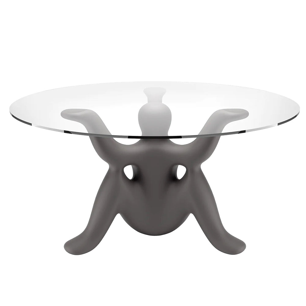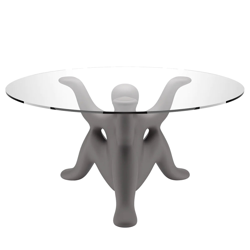 Questi geni con tre gambe e tre bracci fanno da base ad un piano in vetro di 140 cm di diametro.