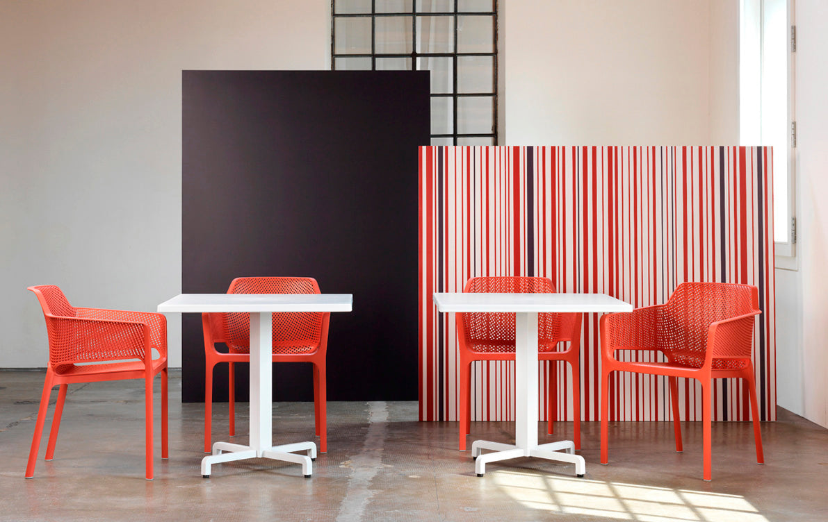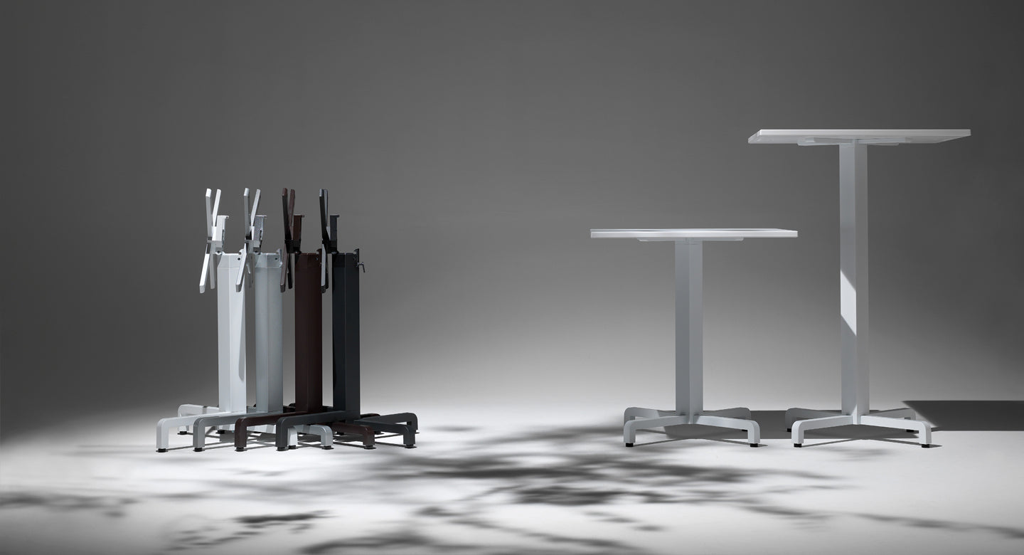 Basamento per tavolo in alluminio verniciato a polveri poliestere, con piedini regolabili. BASE FIORE adatta per piani della misura massima di ø 80 – 80×80 cm.