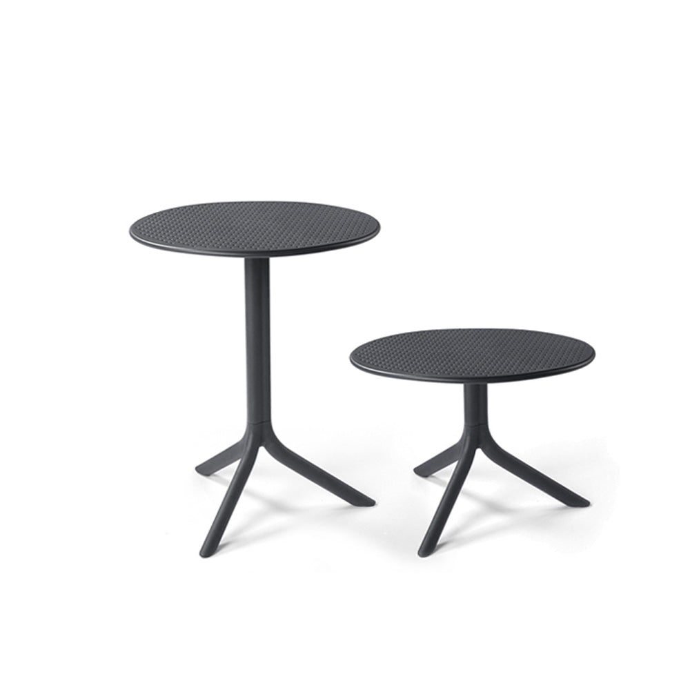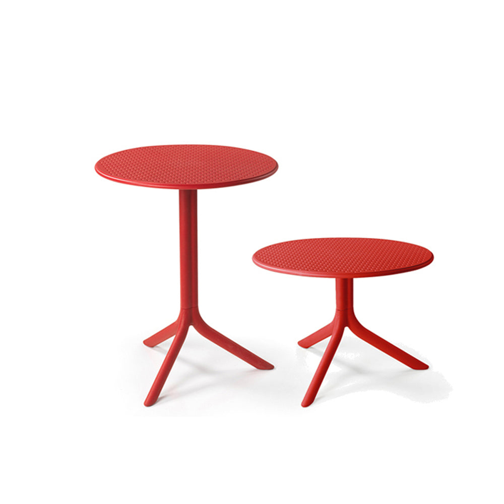 Tavolo con gamba centrale a 3 razze. Materiale: polipropilene fiberglass trattato anti-UV e colorato in massa. Smontabile. Finitura opaca. Dotato di piedini antiscivolo. Possibilità di doppia altezza: 40 cm / 76,5 cm. Resina riciclabile.